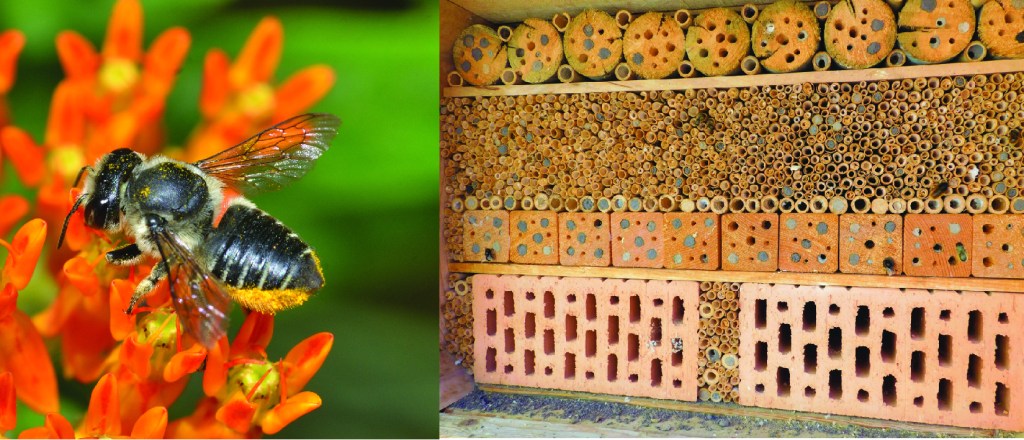 A diferencia de las abejas carpinteras o aquéllas que anidan en el suelo, estas abejas no crean cavidades, sino que utilizan las que ya existen. Este es el grupo de abejas que es fácilmente atraído por esos curiosos “hoteles de abejas” que se pueden construir o comprar. Una opción natural (y económica) para ayudar a estas abejas es no cortar al ras los tallos huecos de algunas plantas al final de la temporada. Muchas abejas anidan dentro de estos tallos, y morirán si éstos son cortados durante el invierno. Las especies de este grupo de abejas anidan en primavera, verano u otoño. Por esta razón, si uno quiere utilizar hoteles de abejas, se recomiendo establecerlos a principios de la primavera.