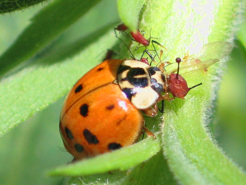 Las mariquitas (o vaquitas de San Antonio) tienen cuerpo ovalado y son de colores brillantes como rojo y amarillo. Las mariquitas son depredadores voraces, y por esta razón son considerados agentes extremadamente importantes de control de plagas. Entre las muchas presas de las mariquitas, se encuentran los áfidos, lo cual hace que se las pueda encontrar en cualquier lugar donde haya un conglomerado de estas pequeñas plagas. Para hacerse una idea del potencial impacto de estos depredadores en el control de áfidos puede ser interesante pensar en la cantidad de presas que cada mariquita consume.
