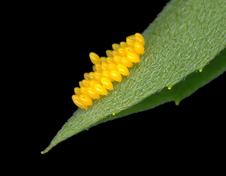 Los huevos son usualmente de color amarillo o anaranjado con forma ovalada. Se pueden encontrar en pequeños grupos (o sea muchos huevos conglomerados, en vez de un solo huevo aislado) en el envés y/o haz de las hojas.