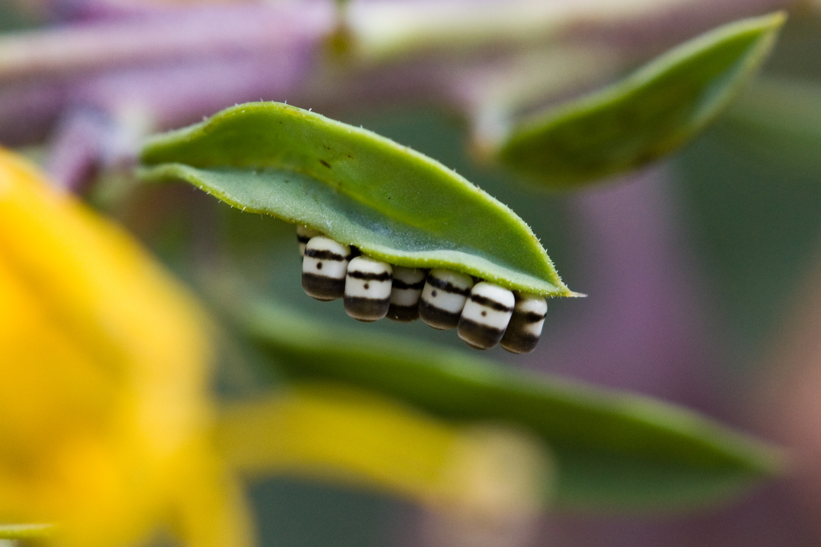 Las larvas de las mariposas Pieris rapae se alimentan de crucíferas, realizando pequeños orificios en las hojas. Estas orugas son de color verde y se camuflan fácilmente al colocarse en la vena central de las hojas. A pesar de que la presencia de estas orugas afecta inicialmente sólo a la estética de las hojas, sin un control adecuado, pueden alimentarse de toda la hoja, dejando expuestas sólo las venas.
