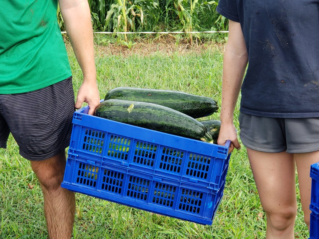 - Al cosechar frutos suaves o sensibles a daño mecánico como el zucchini/zapallito, colocarlos cuidadosamente en los contenedores y en la misma dirección para evitar que el tallo rasgue o dañe la carne del fruto.