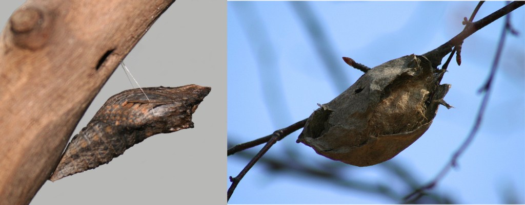 Otros polinizadores, como polillas y mariposas, diapausan en la hojarasca, la madera o en el suelo. Por lo general, lo hacen envolviéndose en hojas secas, cavando en el suelo, o uniendo su crisálida a palos y ramas. Algunos de ellos también diapausan como adultos, escondiéndose en grietas de paredes o pequeños orificios. Para proteger a estos polinizadores, puede intentar dejar partes de su patio sin molestar, manteniendo al menos algunas de sus hojas secas en el suelo.