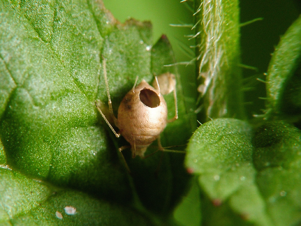 En agroecosistemas diversos las poblaciones de áfidos usualmente se mantienen a raya por medio de sus enemigos naturales (por ejemplo, parasitoides, chinches de las flores y asesinas, sírfidos y mariquitas). Cuando los áfidos han sido atacados por avispas parasitoides su cutícula se vuelve café-dorada y papelosa, y es comúnmente llamada “momia”.