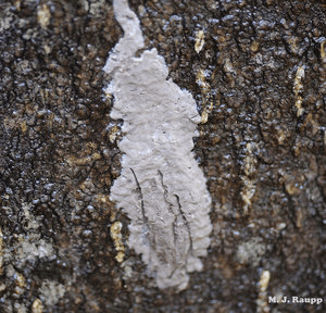 Las masas de huevos recién puestos de la mosca linterna con manchas son de color gris y se camuflan bien en las ramas de los árboles y otras estructuras. Foto: M.J. Raupp, UMD.