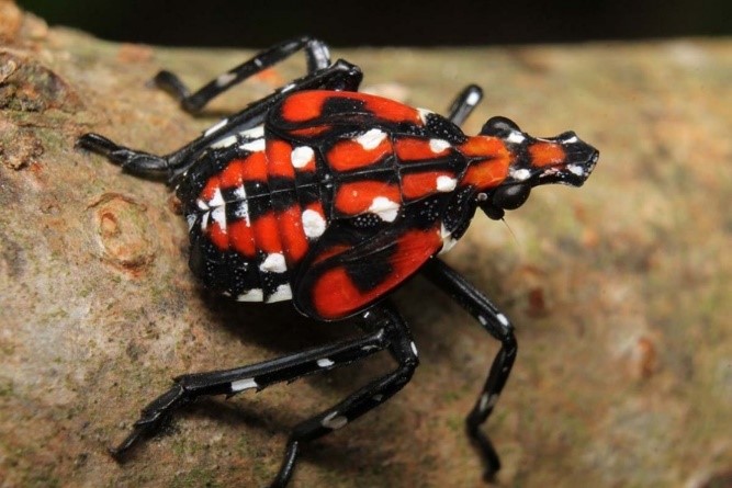 En la fase temprana, las ninfas de mosca linterna con manchas se encuentran a menudo en el nuevo crecimiento de las plantas. Foto: Departamento de Agricultura de Pensilvania.
