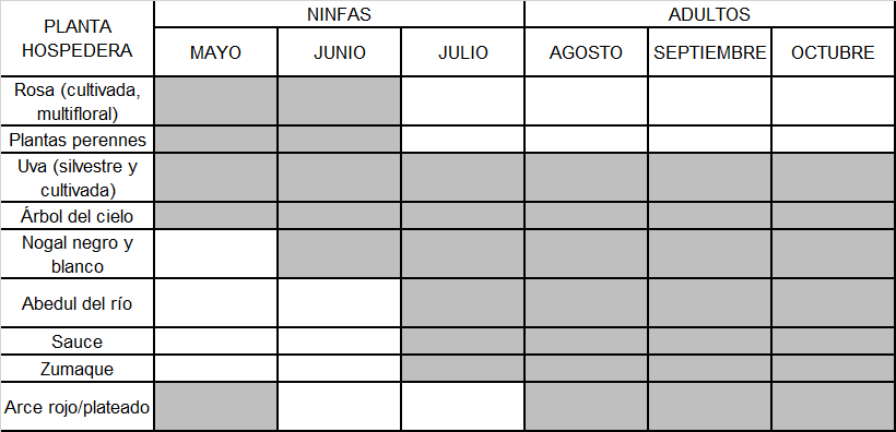 Esta tabla (modificada de este sitio) es una representación no-extensiva de plantas hospederas comunes de las que la MLM se alimenta durante la temporada. La tabla permite conocer cuándo comenzar a monitorear actividades de ninfas y adultos, y en qué plantas hospederas es más probable encontrarlos, con las secciones en gris indicando la potencial presencia de MLM. Se recomienda un monitoreo continuo de MLM, dado que las densidades cambian a lo largo del tiempo tanto durante la temporada como entre años, incluso en la misma planta. El árbol del cielo, Ailanthus altissima, es un árbol invasivo y un hospedero altamente preferido. La información en esta tabla se basa en observaciones del este de Pensilvania y puede variar de acuerdo a las condiciones locales.