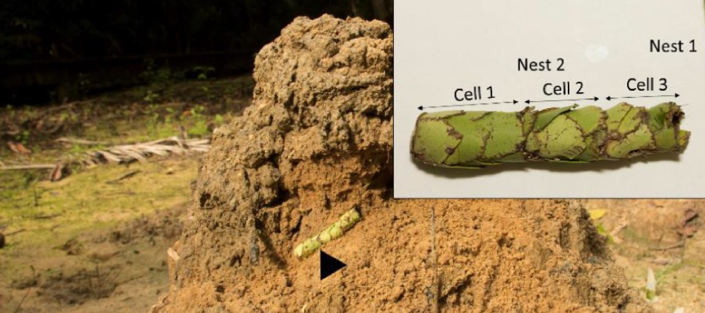 Las megachiles son conocidas por cortar hojas, que utilizan para revestir las celdas de sus nidos. Tenga en cuenta que aquí el nido está en un montículo de suelo, y cada celda está completamente cubierta de hojas, pero tapada y separada de las celdas vecinas. En este nido, cada célula contiene un huevo. Foto: E. Soh.