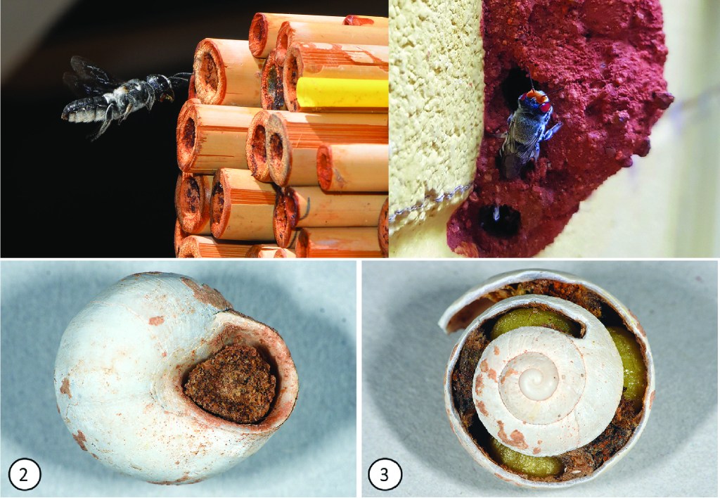 Las megachiles anidan en una gran variedad de lugares y usan muchos materiales distintos. Muchos anidan en cavidades como las que ofrecen los hoteles de abejas (arriba, izquierda; J. y F. Hort; tenga en cuenta los pelos característicos del abdomen), construyen nidos de barro (arriba, derecha; C. Leel), o usan cavidades naturales como las que ofrecen las conchas de caracol vacías. (abajo, Müller et al., 2018).