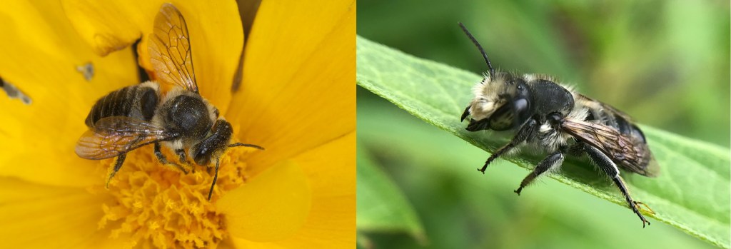 La abeja cortadora de hojas de cola plana es muy común en nuestra región, visitando muchas especies distintas de flores flores y usando sus mandíbulas afiladas para cortar círculos de hojas. Fotos: snanz; H. Holbrook.