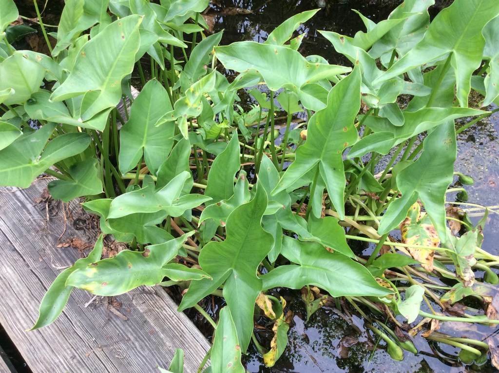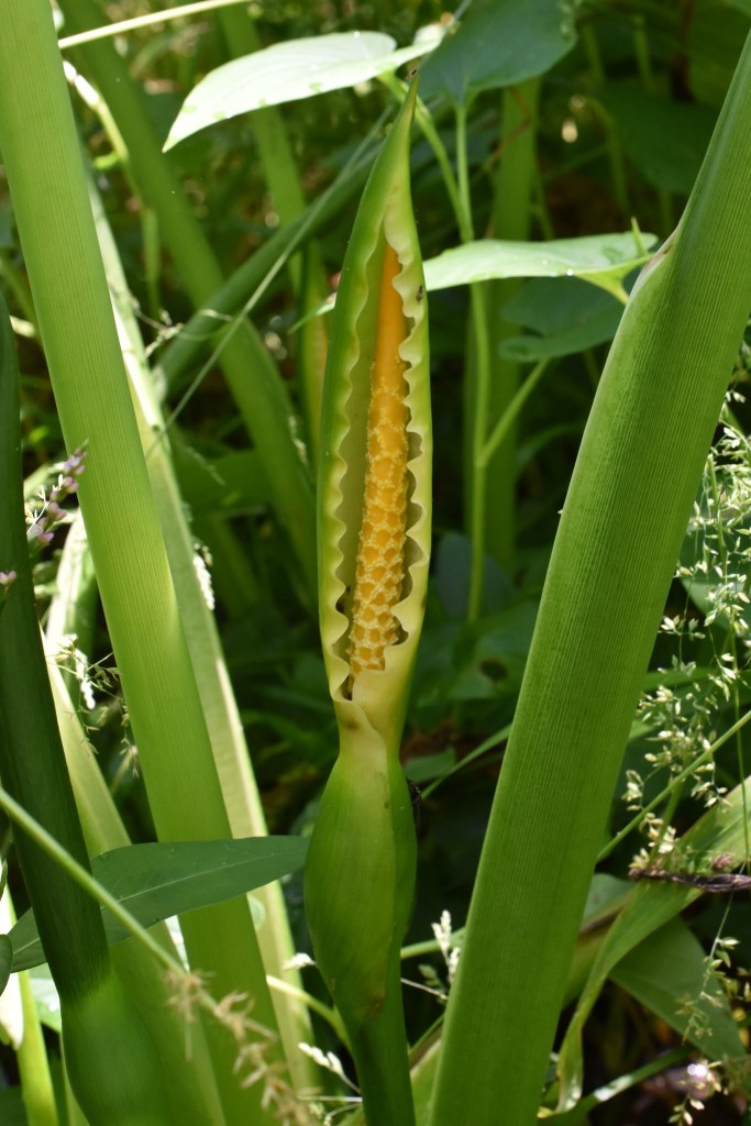 Un caso especial de polinización por insectos de una nativa de Maryland es el del arum flecha verde, cuna de Moisés o tuckahoe Peltandra virginica. La especie pertenece a la familia Araceae y muestra un impresionante sistema de polinización. Como suele ocurrir en esta familia de plantas (véa también el ejemplo de la col mofeta del que hablamos en un posteo anterior), la maduración de las flores femeninas y masculinas está ligada a la producción de aromas específicos. En el caso del arum flecha verde, estos olores atraen a moscas pequeñas, en particular a aquellas de la especie Elachiptera formosa. Estas moscas buscan las flores para aparearse, alimentarse de polen y finalmente poner huevos en la planta, haciendo de éste un ejemplo de lo que se llama polinización de guardería (la planta recibe un servicio de polinización a cambio de proporcionar un sitio de cría para el polinizador). Al moverse a lo largo de la flor, estas pequeñas moscas mueven el polen de las anteras a los estigmas. Parte de este polen puede provenir de la misma planta, pero también de una flor diferente ya visitada por las moscas.