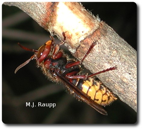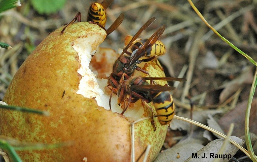 Otro problema que pueden causar es que en los meses de otoño, los avispones europeos necesitan incorporar azúcar y carbohidratos a su dieta. Por esta razón, a menudo se los ve alimentándose de frutas maduras caídas, como manzanas y peras, o de la mielada excretada por insectos cómo los áfidos y las moscas linterna con manchas. He visto mucha actividad de avispones europeos este año, especialmente donde hay abundancia de moscas linterna manchada y la mielada que excretan. Esta mielada es una excelente fuente de azúcar no sólo para los avispones europeos, sino también para otros insectos que pican. Aunque los avispones europeos no son agresivos, sea precavido al trabajar al aire libre y trate de no molestarlos ni a ellos ni a sus nidos.
