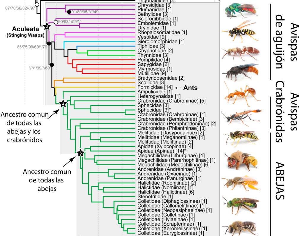 Aunque esto puede sonar como un momento nerd biológico mío, espero que aprecie la enormidad de este principio. Este simple concepto indica que cada uno de nosotros y todas las especies que existen en el planeta hemos compartido ancestros en algún momento de nuestra historia. Todos estamos emparentados, como una gran familia… Y como en todas las familias, el estudio de nuestra historia puede enseñarnos cosas divertidas e interesantes sobre quiénes somos, ayudándonos a entender y explicar las cosas que observamos. Déjeme entonces ahora contarle sobre lo que el estudio de las filogenias nos ha enseñado sobre las avispas y las abejas (y su historia compartida) y por qué esto excusa en parte nuestra ocasional dificultad en distinguirlas.
