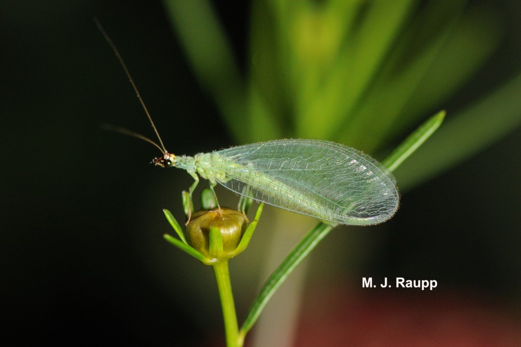¿Alguna vez ha estado observando una planta, a menudo el tronco o la rama de un árbol, y ha visto un pequeño trozo de liquen o cera blanca algodonosa (del tamaño de una pasa pequeña) moviéndose hacia arriba o hacia abajo? Si es así, ha tenido la suerte de ver a una larva depredadora de crisopa transportando deshechos. Como un ingenioso medio de camuflaje, las larvas de crisopa transportadoras de deshechos se cubren con trozos de líquenes, restos de material vegetal, cera blanca algodonosa o partes de sus presas. Al observar más de cerca, se pueden ver las patas y un par de mandíbulas en forma de hoz que sobresalen de los restos, indicando que se trata de una larva de crisopa transportadora.