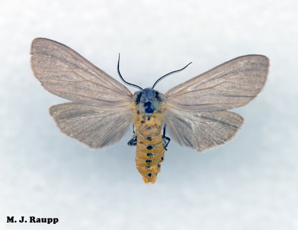 Otros comedores de algodoncillo que también presentan este mimetismo incluyen a los escarabajos rojos del algodoncillo, las chinches de algodoncillo y los escarabajos de hojas de algodoncillo. Como decía antes, al igual que las larvas de la monarca, las orugas de la polilla del algodoncillo obtienen glucósidos cardíacos de estas plantas y los retienen como adultos. Una diferencia es que mientras que las orugas de la polilla lucen audazmente los característicos colores de advertencia de naranja y negro, la polilla adulta es comparativamente monótona a primera vista, con alas de color marrón pálido… pero su impresionante abdomen luce los colores naranja y negro de Halloween.