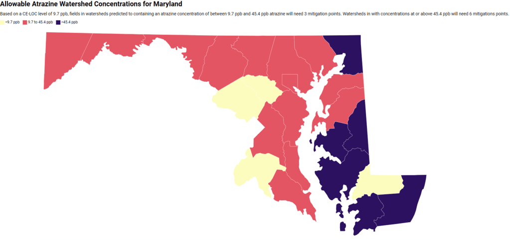 En Maryland, se usaron ~ 232,000 libras de atrazina en 2022. Consulte la siguiente figura (desarrollada por Kurt Vollmer; también disponible en este enlace) para las mitigaciones a nivel de condado basadas en las concentraciones de atrazina en las cuencas hidrográficas (4 condados tienen menos de 9.7 μg/L de atrazina y requieren 0 puntos, 13 condados y la ciudad de Baltimore tienen de 9.7 a 45.4 μg/L de atrazina y requieren 3 puntos, y 6 condados tienen más de 45.4 μg/L y requieren 6 puntos).