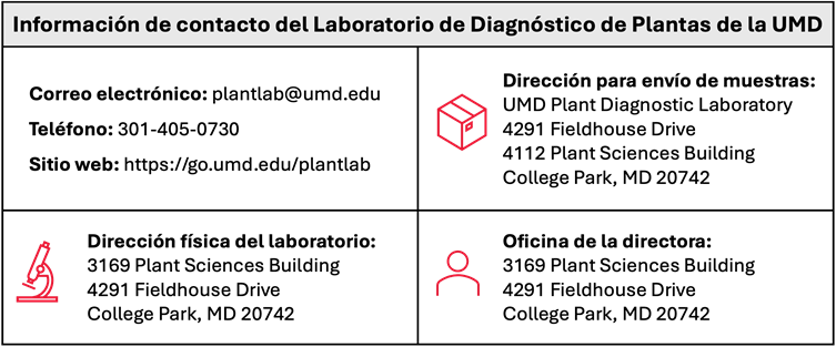 - Complete el formulario para recepción de muestras del PDL. Puede encontrar el formulario en nuestra página web (https://go.umd.edu/plantlab). Si no encuentra el formulario en español o necesita ayuda para enviar la muestra, envíenos un mensaje por correo electrónico a plantlab[arroba]umd[punto]edu. Incluya su nombre e información de contacto y le enviaremos el formulario o nos comunicaremos por teléfono.
