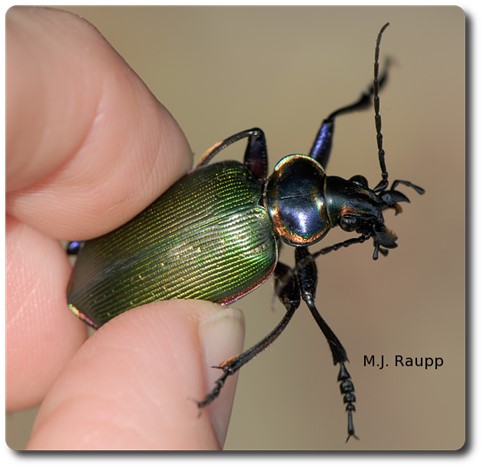 Los escarabajos Calosoma son especialmente llamativos por su coloración: élitros (alas exteriores) de un verde metálico bordeados de dorado, con cabeza y tórax de un tono azul negruzco. Tanto los adultos como las larvas son depredadores. Los escarabajos Calosoma son comunes en sistemas ornamentales, áreas de césped, bosques y campos. Trepan árboles para encontrar presas como los gusanos cancros, orugas de carpa oriental y orugas de la polilla gitana.