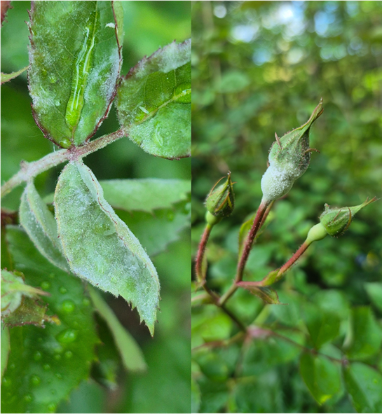Crecimiento polvoriento y blanco que cubre la superficie superior e inferior de las hojas, tallos, brotes, sépalos, y pétalos. Cuando la infección es extensa, las hojas pueden deformarse y las ramas pueden empezar a morir desde la punta hacia el interior de la planta. El hongo sobrevive como pequeñas estructuras negras en tejidos sintomáticos o en hojas caídas. En la primavera, las estructuras producen esporas que pueden infectar nuevas hojas.