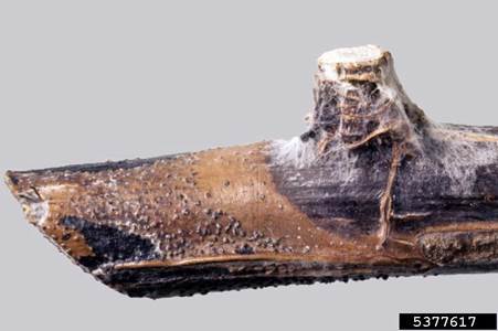 Inicialmente, se observan áreas amarillentas o rojizas con bordes definidos en los tallos. Estas áreas son chancros que se expanden y se tornan de color marrón y luego negro. A veces, tienen una apariencia hundida. Los chancros son causados por hongos que han infectado heridas naturales en la planta o aquellas causadas por herramientas, insectos y otros animales, granizo u otro daño mecánico en los tallos. Las hojas de las ramas afectadas comienzan a marchitarse y mueren. Con el tiempo, se forman pequeñas estructuras negras en las áreas con chancros, en las cuales el hongo produce esporas que pueden dispersarse por el viento, lluvia, y animales.